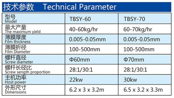 吹制各种规格的低密度聚乙烯、高密度聚乙烯和线性低密度聚乙烯塑料薄膜,广泛应用于食品百货、日用、化工、针纺品、购物礼袋和工业包装。机筒、螺杆采用38CrMoAl合金材料经氮化处理精密加工而成,具有很好的耐磨和耐腐蚀性。