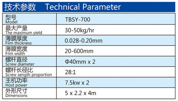 吹制各种规格的低密度聚乙烯、高密度聚乙烯和线性低密度聚乙烯塑料薄膜,广泛应用于食品百货、日用、化工、针纺品、购物礼袋和工业包装。机筒、螺杆采用38CrMoAl合金材料经氮化处理精密加工而成,具有很好的耐磨和耐腐蚀性。