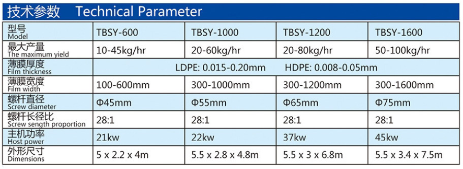 吹制各种规格的低密度聚乙烯、高密度聚乙烯和线性低密度聚乙烯塑料薄膜,广泛应用于食品百货、日用、化工、针纺品、购物礼袋和工业包装。机简、螺杆采用38CrMoAl合金材料经氮化处理精密加工而成,具有很好的耐磨和耐腐蚀性。