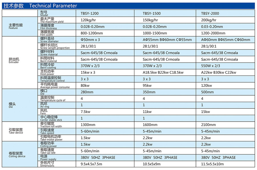 选购配置 1.自动吸料机 2.空压机 3.快速换网 4.旋转模头 5.双风口风环 6.双工位收卷 7.气涨轴 8.自动换卷 9.牵引升降 10.米克重 11.铸铝加热圈 12.电晕处理机 13.热封刀 14.废边机 15.宽度控制器 ...