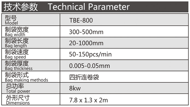 机器特性 此设备为生产连卷四折平底垃圾袋的专用设备,单通道高速无拉伸操作简便,底封好,收卷整齐,个数准确,手动手卷。此设备采用全钢板一体而成,用电220v照明电即可。
